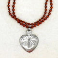 Deep red antique red coral is 50-80 years old, found in Istanbul. Etched sterling silver heart, cast from an antique Mexican milagro, antique pearl details, hand knotted on cinnamon nylon cord to wear doubled, no closure. 54"