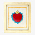 A sacred heart milagro, a symbol of miracles. Original art by Luis Romero, hand painted on papel amate, a traditional Mexican handmade paper. Expect slight variations in details, making each piece one of a kind. Signed by the artist.