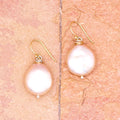 Luminous freshwater pearls in creamy white and golden pink hues, handmade 14 karat gold french hooks and sterling silver beaded posts. 15x20mm pearls. 1 1/2"