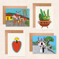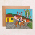 Town Guadalupe art card 4.25 x 5.5 (A2) with kraft envelope. Printed on 100lb. cream cotton card stock with matte finish and blank interior. Original artwork by Luis Romero for River Song.